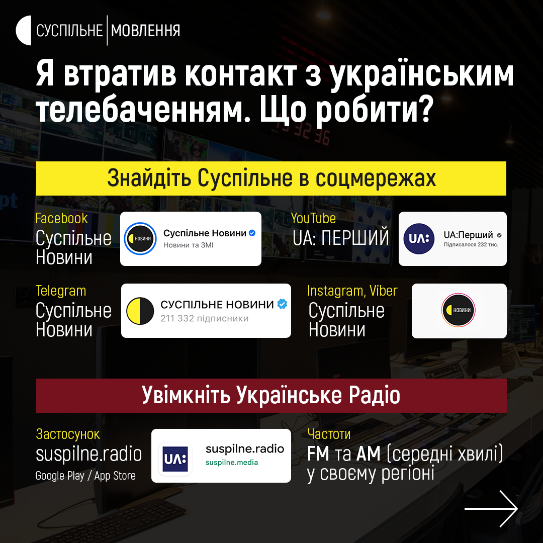 Додамо, якщо ви втратили сигнал українського телебачення, перемикайтеся на Українське Радіо (АМ та FM по всій країні) і цифрові платформи Суспільного. Саме оперативне інформування й перевірка повідомлень допомагає зберігати спокій та протидіяти дезінформації окупантів.