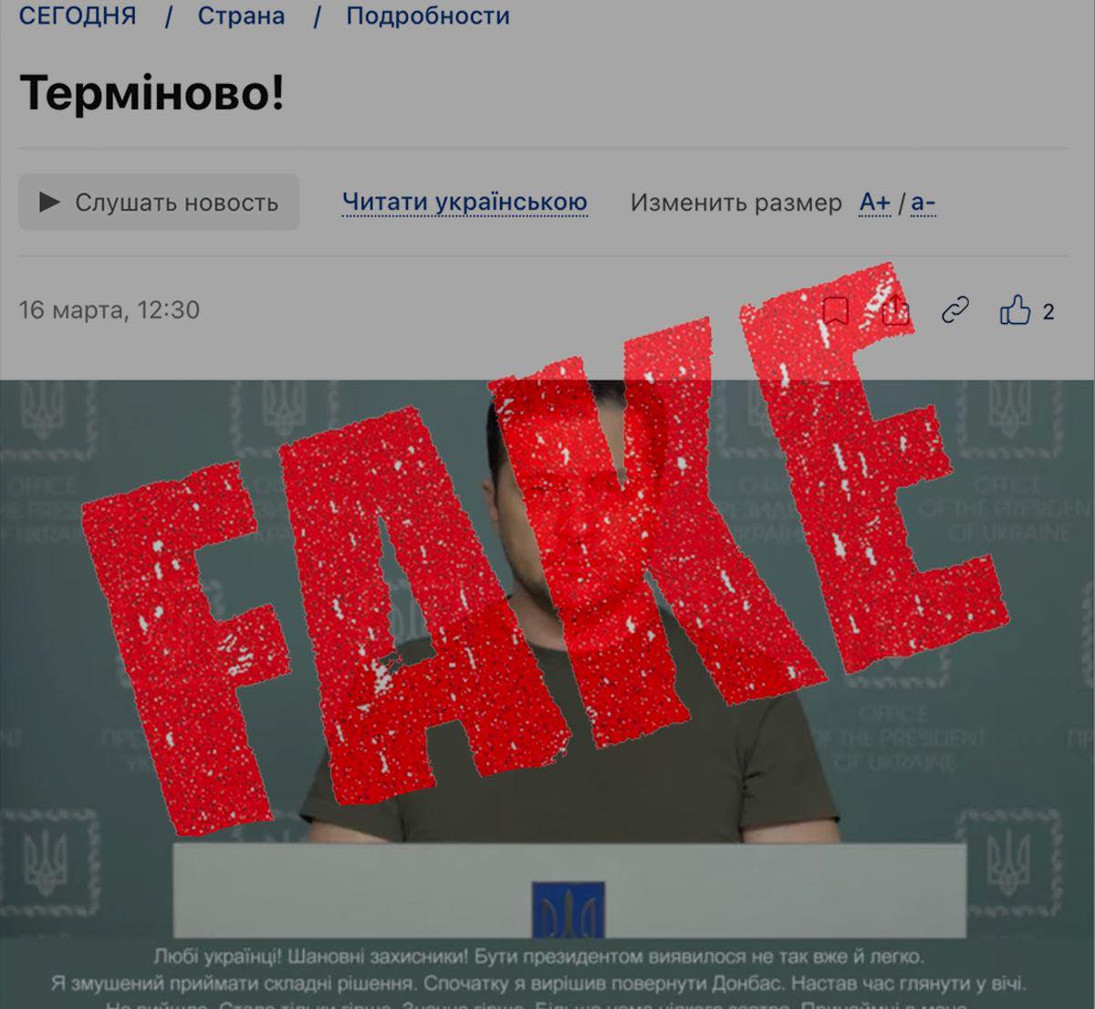Російські хакери зламали рухомий рядок телеканалу “Україна 24” та сайту “Сегодня” і транслюють фейкове повідомлення президента Володимира Зеленського про нібито “капітуляцію”.