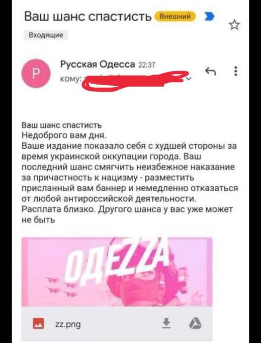 Одеські ЗМІ почали отримувати анонімні листи від відправника “Русская Одесса” російською мовою з темою “Ваш шанс спастисть” (орфографію збережено) з погрозами та закликом “відмовитися від антиросійської діяльності”.
