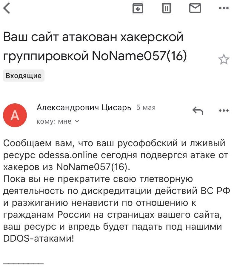 “Повідомляємо вам, що ваш русофобський та брехливий ресурс odessa.online сьогодні зазнав атаки від хакерів з NoName057(16). Поки ви не припините свою згубну діяльність з дискредитації дій зс рф та розпалювання ненависті стосовно громадян росії на сторінках вашого сайту, ваш ресурс і надалі падатиме під нашими DDoS-атаками!” – йдеться в листі до редакції.