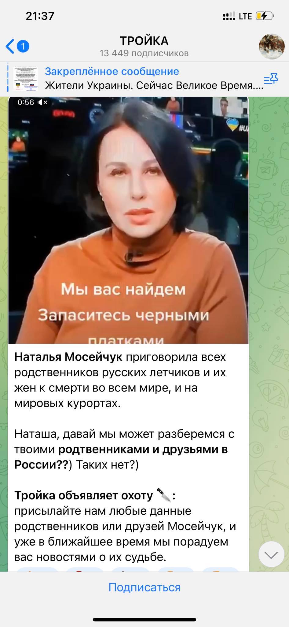 “Мосейчук Наталья Миколаевна… как думаешь, сколько в крипте могут закинуть по приколу наши граждане чтобы тебе на выходе из квартиры… в Киеве… пробили голову ледорубом за послание к семьям наших летчиков? Думаем за пол битка в вашей Шумерии найдутся умельцы которые еще сделают это со стримом в прямом эфире)”, – написано в каналі.